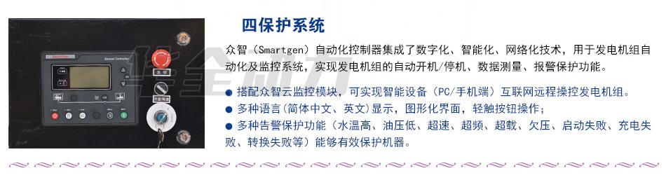 四保護系統 眾智(Smartgen)自動化控制器集成了數字化、智能化、網絡化技術,用于發電機組自動化及監控系統,實現發電機組的自動開機/停機、數據測量、報警保護功能。