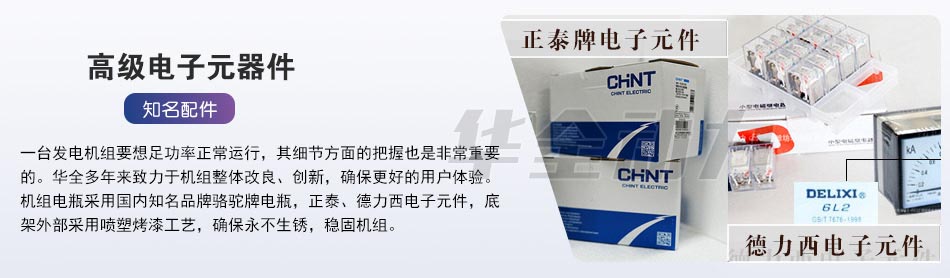 一臺發電機組要想足功率正常運行,其細節方面的把握也是重要的。華全多年來致力于機組整體改良、創新,確保更好的用戶體驗。機組電瓶采用國內知名品牌駱駝牌電瓶,正泰、德力西電子元件,底架外部采用噴塑烤漆工藝,確保永不生銹,穩固機組。