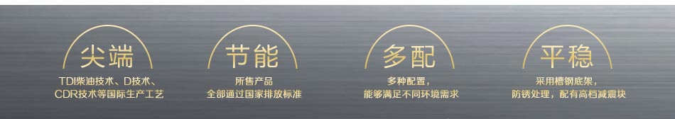(TDI柴油技術、D技術、 CDR技術等國際生產工藝)、節能(所售產品 全部通過 排放標準)、多配(多種配置, 能夠滿足不同環境需求)、平穩(采用槽鋼底架, 防銹處理,配有 減震塊 )