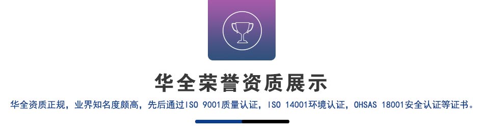 華全資質正規,業界知名度頗高,先后通過ISO 9001質量認證,ISO 14001環境認證,OHSAS 18001安全認證等證書。